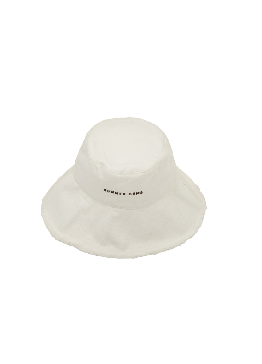 The Solid Accessories Bucket Hat is a chic sun essential with a relaxed silhouette and a wide, floppy brim. Made from soft, breathable fabric, it features frayed edges and embroidered “SUMMER GEMS” detail on the front, adding a playful yet elegant touch to any summer look. Ideal for beach days, strolls, or effortless accessorizing.