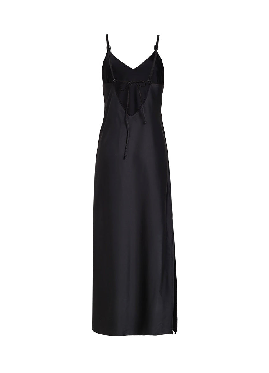The Aurelia Dress is a sleek slip silhouette with a deep open back, adjustable straps, and a side slit that adds movement. Made in our shiny black fabric, it drapes naturally over the body with a soft, flowing finish. Designed for warm nights and golden hour moments, this dress is a timeless staple in every summer wardrobe.