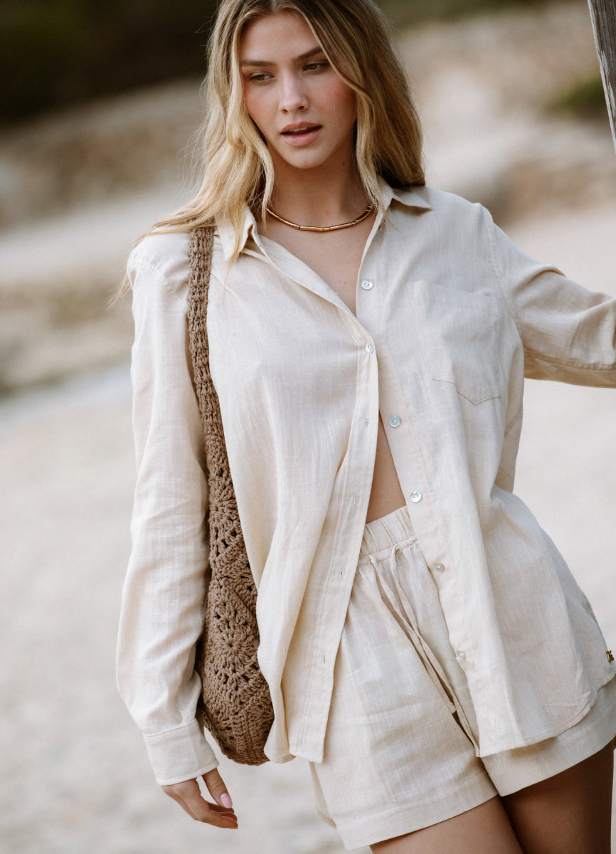 Essential Short with an elastic waistband and pockets, made from cotton with a linen effect, offering a comfortable design.