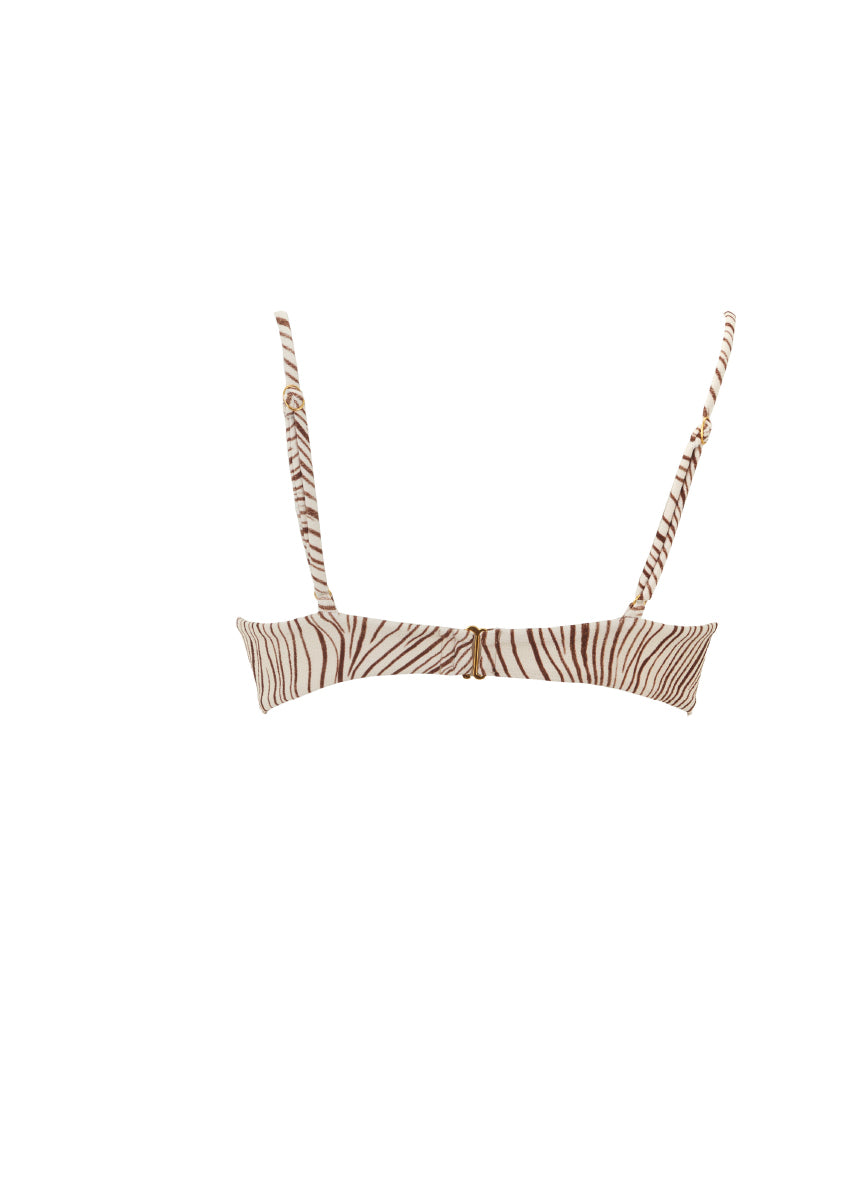 The Sunny Top from the Eternal Sands print collection blends classic sophistication with structured support. Featuring a subtle earth-toned woodgrain pattern, this underwire bikini top offers a flattering, sculpted silhouette with timeless charm.