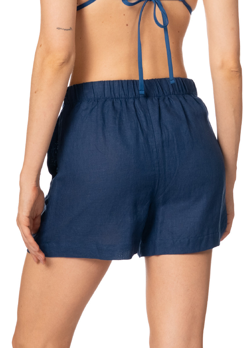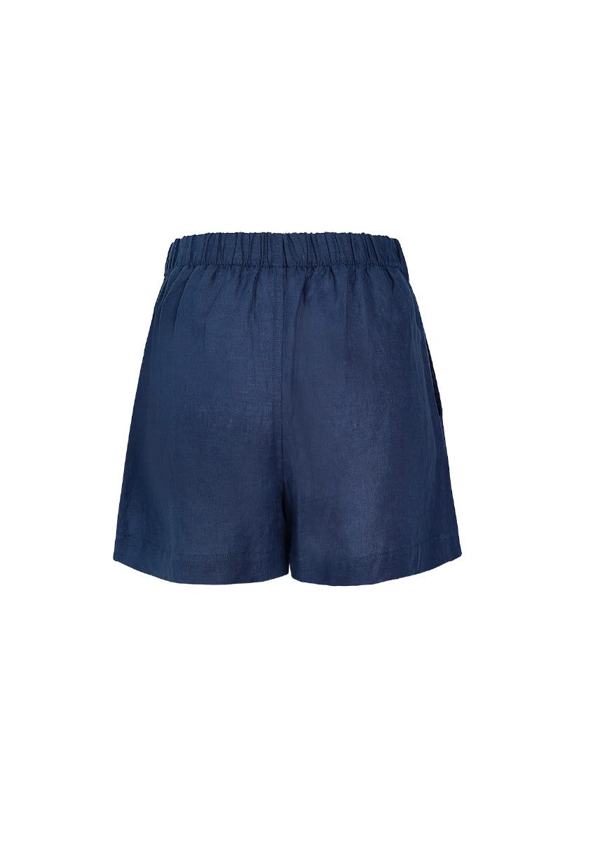 The Nora short is crafted in light linen with a fix waist in front and elastic band in the back. It has exposed pockets on the sides and back and zipper in from that ends in button up.