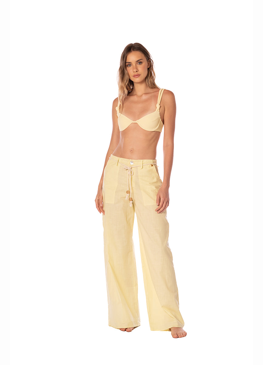 The Fer Essence Top in solid sun combines structured support with minimalist elegance. This moulded cup top features subtle texture that adds dimension to the design, while adjustable straps with knotted shoulder details offer customised fit and a distinctive touch. The adjustable back closure ensures all-day comfort, and the preformed cups provide natural support without padding. The luminous sun tone brings solar warmth to the Terra Di Sole collection.