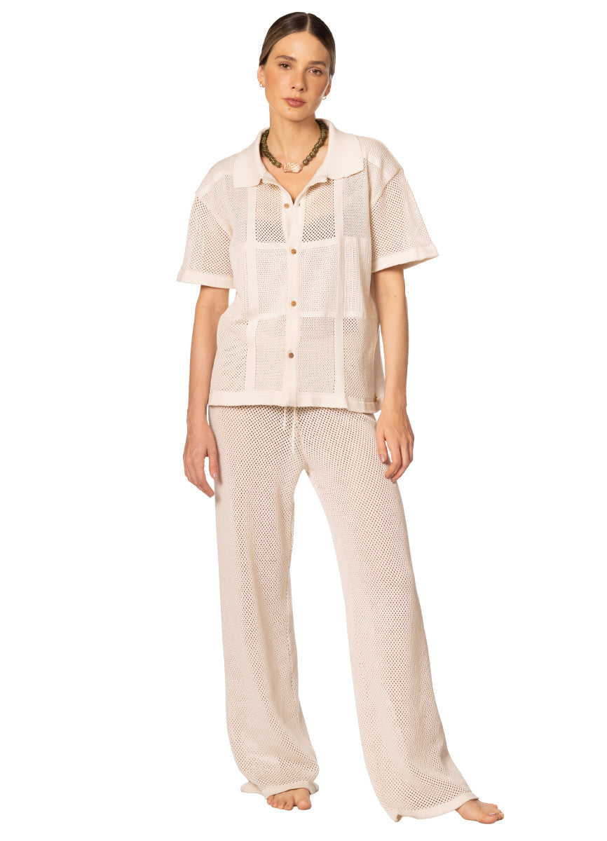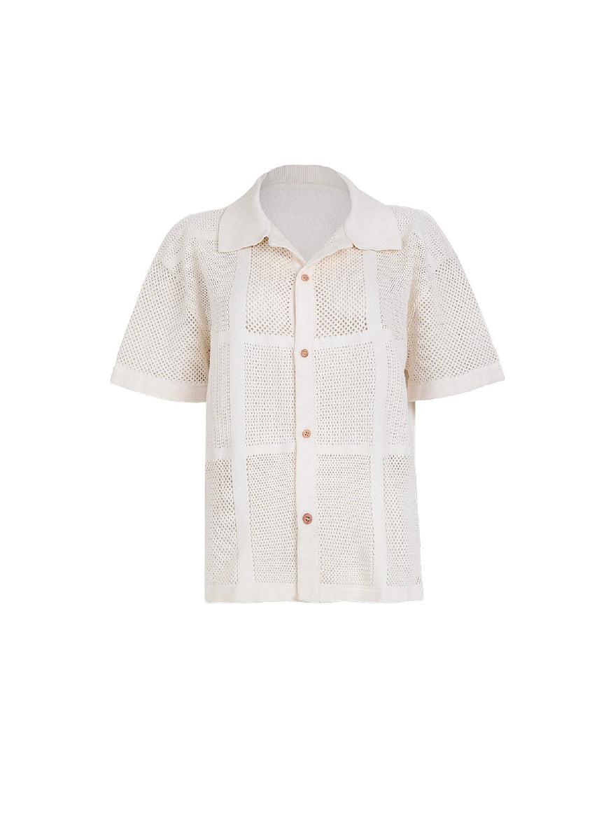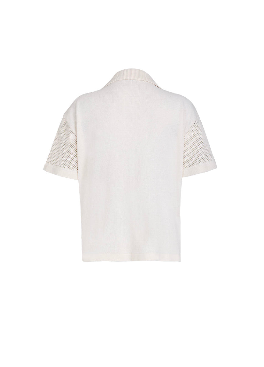 Our jasmin shirt is a Go to. Ideal for different weathers. It features a structured neck, button down shirt and short sleeve. Crafted in recycled cotton and made as a patchwork in different knits, its and ideal piece.
