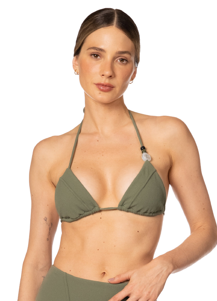 The Maui Top in our signature fabric is a reimagined classic. Featuring adjustable neck and back ties and sliding triangle cups, it offers customizable support with a feminine touch. Subtle gem details elevate the design.