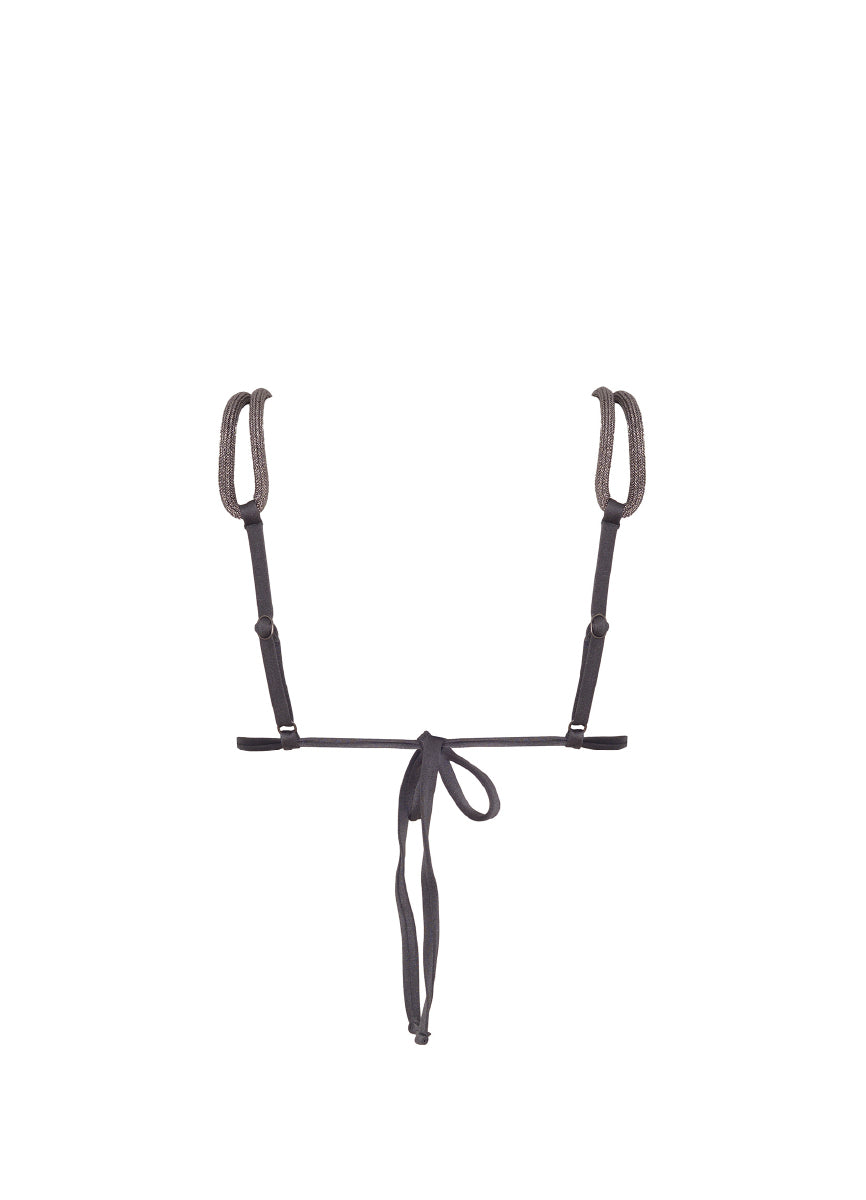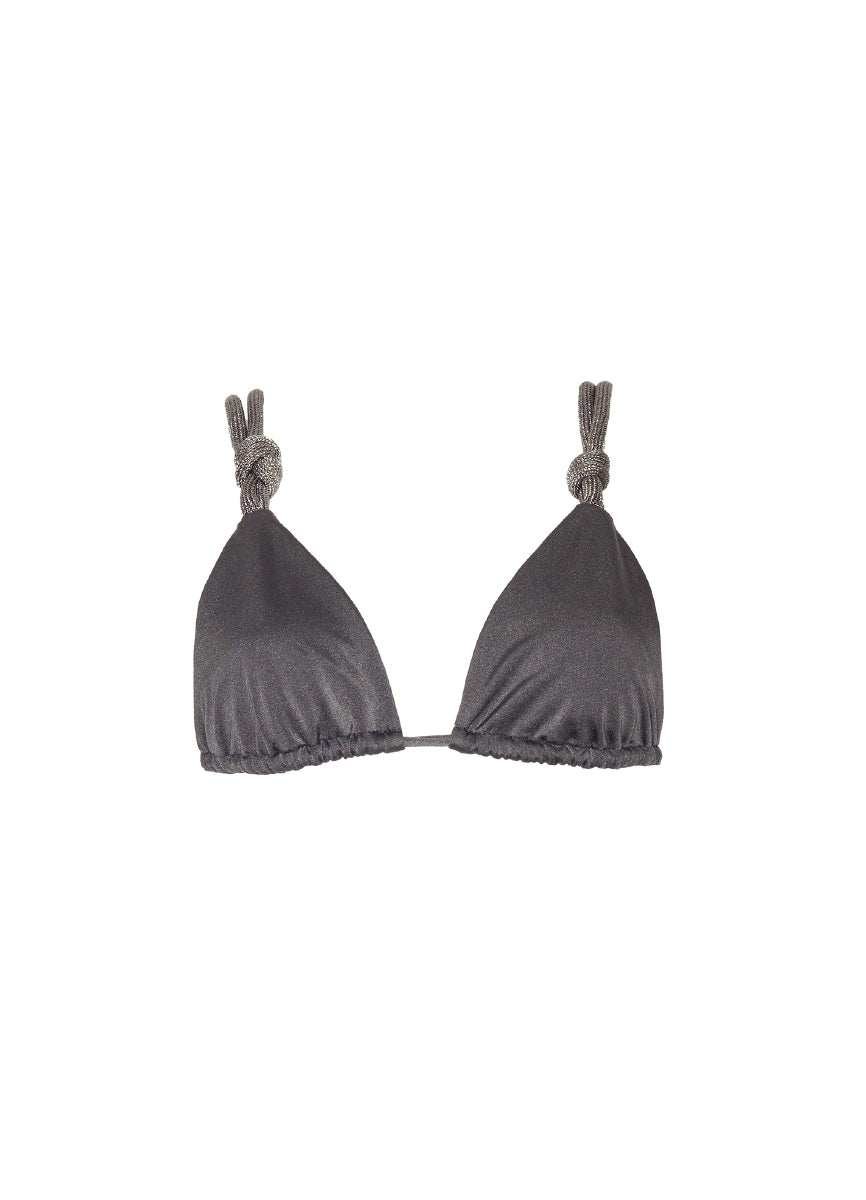 Triangle top in shimmer fabric with silver cord knotted details. Adjustable back and straps and removable cups.